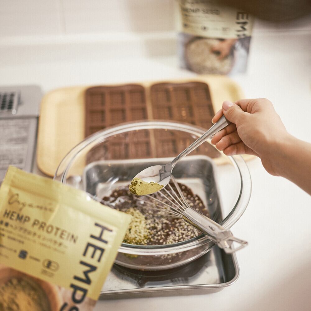 ヘンプ(麻の実)の種子をコールドプレス製法で脱脂後、残った残渣機械的に微粉末化粉砕した粉末が「ヘンププロテイン」です。