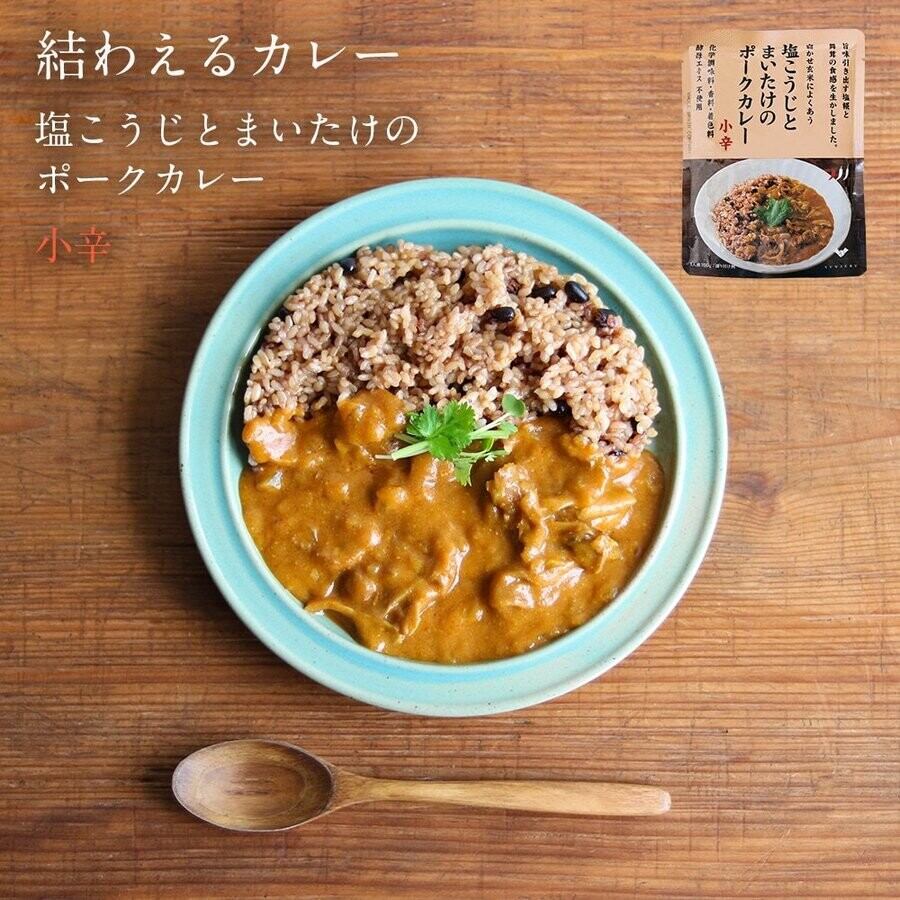 ●味の特徴国産豚肉のうま味、玉ねぎの甘み、まいたけの食感、塩糀のコクがクセになる味わいのオリシ?ナルレトルトカレーて?す。辛さは「中辛」ですが、少し甘めの味付けですので、辛いものが少し苦手な方でも食べやすい辛さです。